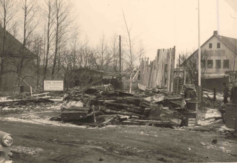 Jetzt hatten sich 13 Personen und 2 kleine Kälber auf dem Boden in Sicherheit gebracht. Doch der Sturm wühlte die umgebenden Wassermassen zu einem mächtigen Seegang auf. Brecher donnerten mit aller Gewalt gegen die Gebäude. Das Wasser stieg weiter. Die Vorderfront der Moorkathen brach zusammen, ebenso die Scheune, wo ein Sohn Schutz gesucht hatte. Von ihrem beschädigten Haus mussten sie mit ansehen, wie das Nebenhaus Stück für Stück den Wellen zum Opfer fiel und die Menschen mit fortgerissen wurden. In den Moorkathen stieg das Wasser bis auf den Boden, so dass die Frauen zuletzt in der höher gelegenen Rauchkammer unter Wurst und Schinken hockten. Erst am Nachmittag gegen 17.00 Uhr kam das erste Schlauchboot und befreite zunächst die Frauen. Es wollte gleich zurückkehren, um auch die Männer zu holen. Doch es dauerte dann noch Stunden, so dass die Männer inzwischen über das Schicksal ihrer Frauen zutiefst beunruhigt waren. Das Boot, das die Männer holen wollte, war gekentert, so hatte sich ihre Rettung verzögert. Haus, Stallungen, 3o Stück Hornvieh, 4 Pferde, 20 Schweine und die Hühner gingen verloren. Doch die Menschen hatten ihr Leben gerettet und den Mut behalten, noch einmal von vorn anzufangen.